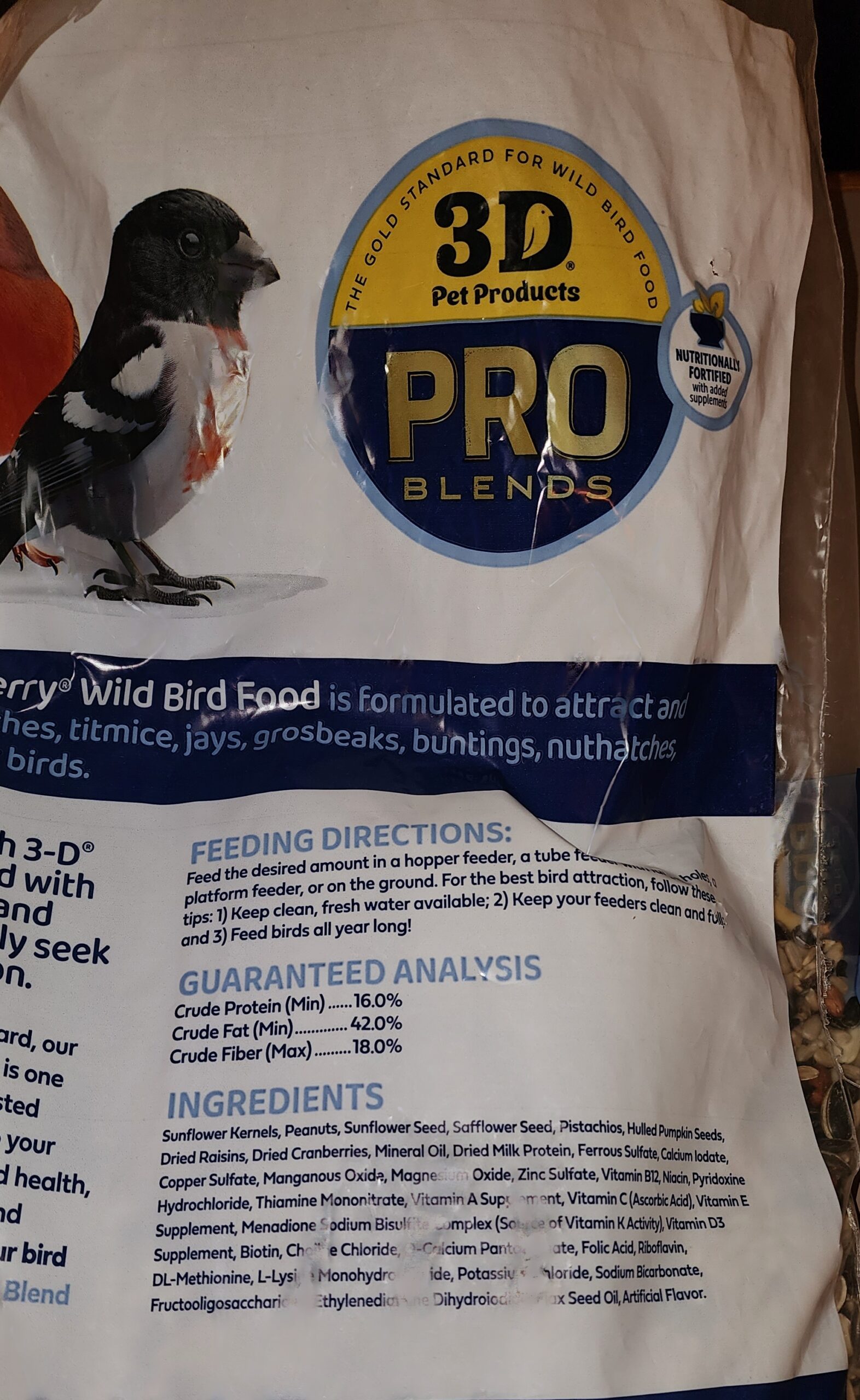 3-D PRO (formerly packaged as 3-D PREMIUM) wild bird food formula changed recently – every seed they sell is now coated in MINERAL OIL which is TOXIC to BIRDS. The package shows MINERAL OIL is first ingredient after the actual seeds. 3-D PRO is now coating seeds to extend shelf life and profits. Dirty business and the birds want no part of it. They will not eat the mineral coated seeds. I feed our birds year-round and used to regularly have 4 sets of Cardinals, flock of chickadees, titmice feasting on the former PREMIUM blend. Not anymore.